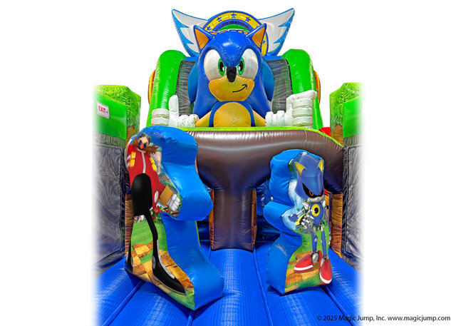 Bring the speed and adventure of Sonic’s world to your next event with this officially licensed Sonic 50 Obstacle Course ! Players enter through a golden ring portal alongside Sonic and Tails, navigate dual-lane climbers, dodge villain pop-ups, and race through Green Hill Zone-inspired landscapes. The course ends with a thrilling slide, complete with an optional water misting system for an extra splash of fun.